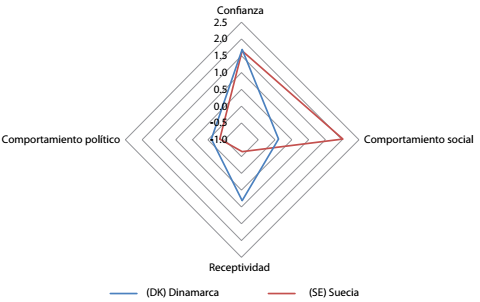 Con estos datos se pone de manifiesto que, en estas economías fuertes, la confianza aparece alta y positivamente asociada al PIB per cápita: en los dos países los coeficientes son positivos y elevados (son los más elevados de todos los resultantes). Parece mostrarse que la confianza en las instituciones supone un motor determinante de la riqueza. En contraste, los dos países arrojan valores negativos o tendentes a cero en lo que se refiere al “comportamiento político”. El comportamiento social (es decir, aspectos como reciclar o pertenecer a una organización ciudadana o social) se muestra muy relevante en el caso de Suecia. Por último, en cuanto a la “receptividad”, mientras que para Dinamarca el valor es positivo (0.82), en Suecia es negativo (-0.63).