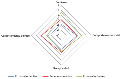 En este clúster los datos son mixtos. No hay variables que tengan un sentido predominantemente negativo (como ocurre con los países de economías más débiles), como tampoco predominantemente positivo. De manera más específica, para todos los factores hay dos o tres países para los cuales el valor es negativo. Por lo tanto, se puede decir que en estos países, globalmente, los componentes intangibles contribuyen a incrementar el PIB per cápita. Los coeficientes de la “confianza” y del “comportamiento político” tienden más hacia lo positivo de lo que lo hacían en los países del clúster de economías débiles, mientras que el del “comportamiento social” acumula rangos negativos o tienden a 0.