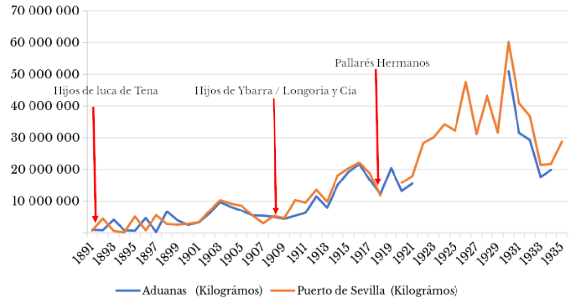 Fuentes: elaboración propia con base en ecee (1891-1921; 1930-1934) y Autoridad del Puerto deSevilla (1891-1935), ahptos.