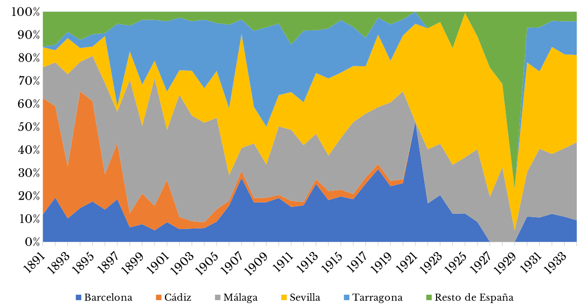 Fuentes: elaboración propia con base en ecee (1891-1921 y 1930-1934), Cámara Oficial de Comercio, Industria y Navegación de Málaga (1911-1933); Cámara de Comercio y Navegación de Barcelona (1912-1925), Autoridad del Puerto de Sevilla, ahptos; Ruiz (2004).