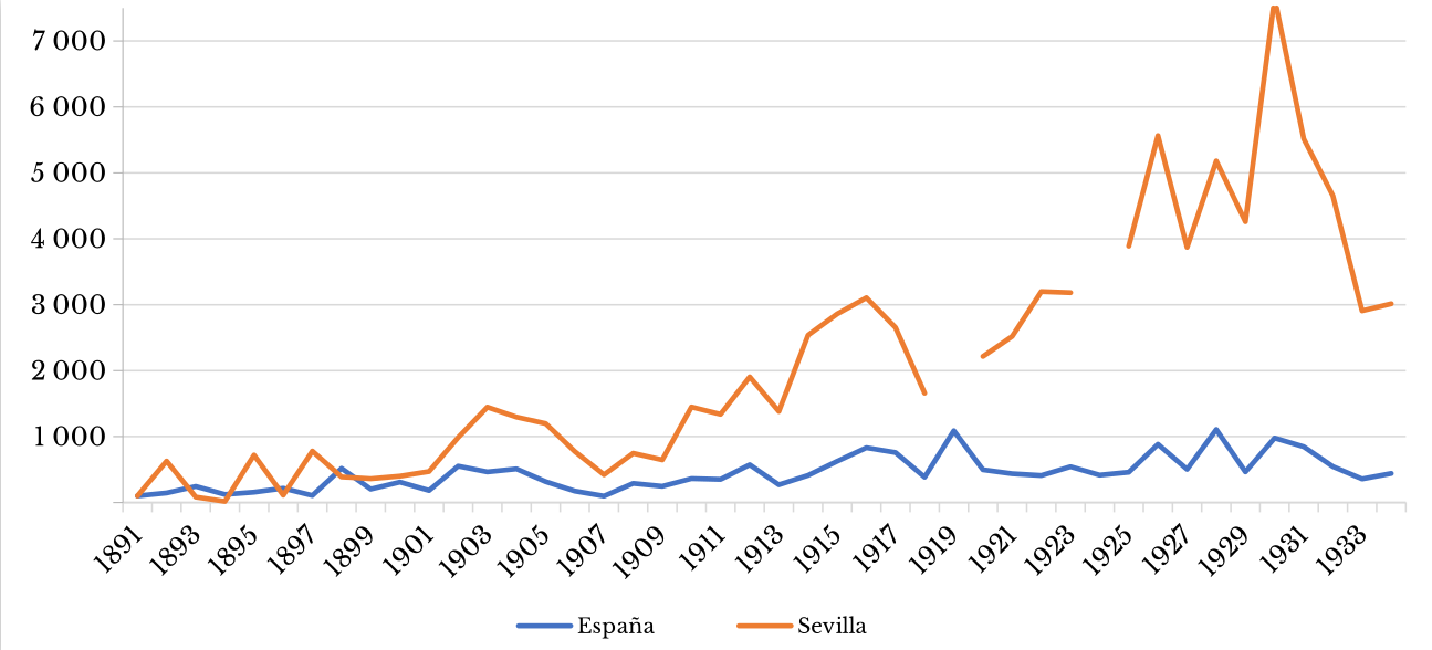 Fuentes: elaboración propia con base en ecee (1891-1934) y Autoridad del Puerto de Sevilla (1891-1935), en ahptos.