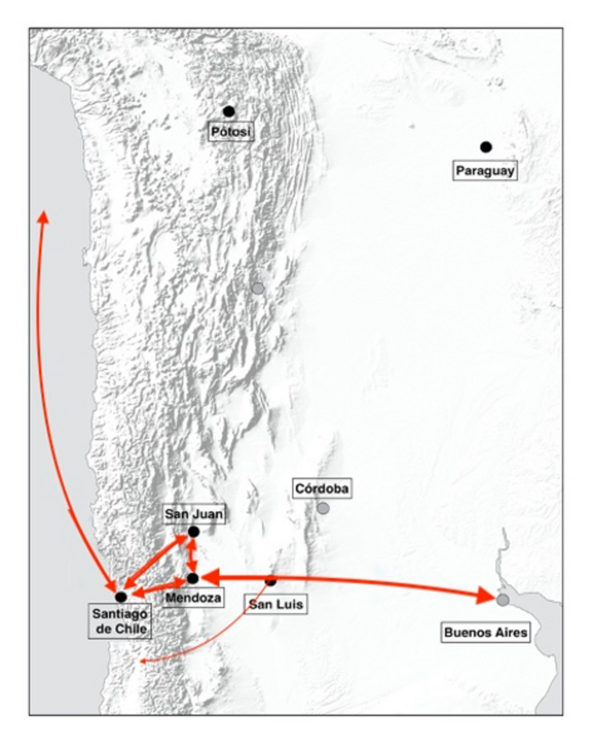 En el análisis interno del cps cordillerano, la ciudad de Mendoza recibió envíos sólo en un porcentaje levemente mayor que la ciudad de San Juan. Este dato es muy interesante ya que, en un principio, lo legal era el cruce por el paso de Uspallata, mientras que el cruce de Los Patos en San Juan era considerado "el camino del contrabando" (Palomeque, 2006). La población de San Juan apenas superaba los 7 000 habitantes (Acosta, 2004), lo que representaba un mercado insuficiente para consumir los 4 395 registros de bienes declarados y las 532 notas de aduana que llegaron en sólo cinco años. El paso hacia la otra banda de la cordillera es más que obvio. Se cuenta con algunas guías en particular, que declararon abiertamente el paso desde San Juan a Copiapó, ciudad chilena más cercana y con un gran mercado minero. ¿La convulsión militar animó la posibilidad de infringir la ley intentando negocios más lucrativos por fuera del pago de las tasas?