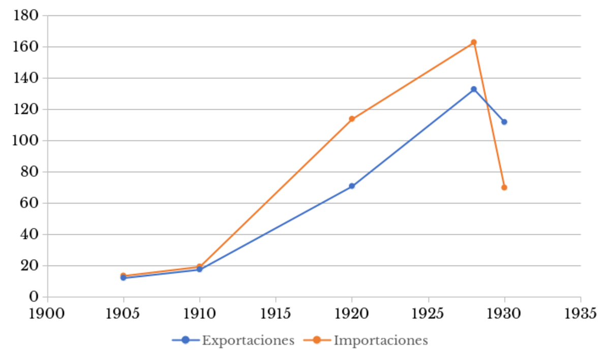 Gráfica 1 Comportamiento de las importaciones y las exportaciones entre 1905 y 1930 (valor en millones de pesos)