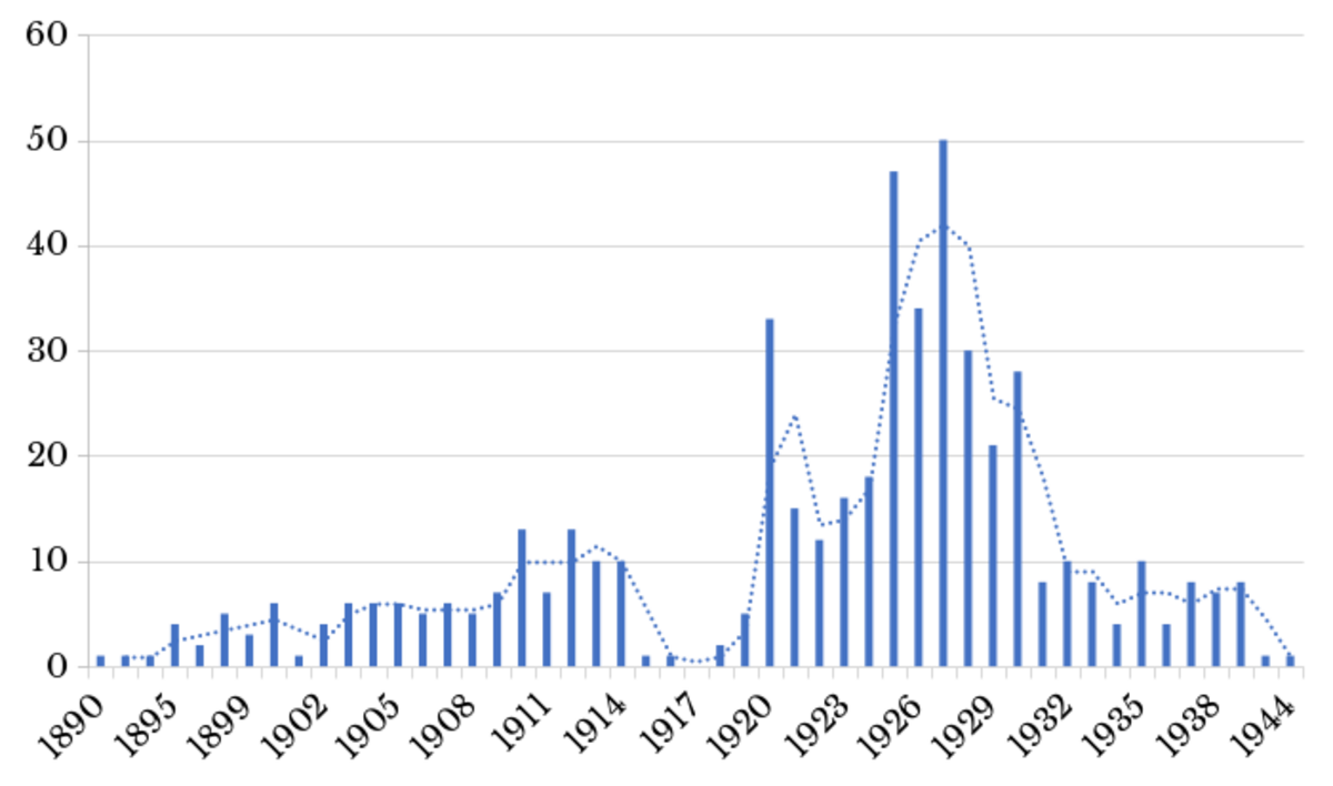 La gráfica 2 debe leerse como una aproximación al comportamiento del flujo migratorio, pues la escasez de información no permite elaborar un modelo exacto. Los datos provienen de una muestra de 507 siriolibaneses que llegaron entre 1890 y 1944, alrededor del 10% de esos migrantes, de los que se conoce su fecha de entrada gracias a la información recopilada por Ahmad Mattar (1945), descendiente de esta migración. Sin embargo, el número debe ser más alto, pues no existen datos de Ocaña y Honda, y como el mismo autor reconoce, el nivel de subregistro es muy alto. Con todo, la información fue recolectada en 1935, cuando aún vivían los pioneros, y hasta el momento representa la única fuente que permite estudiar con datos puntuales el flujo migratorio.