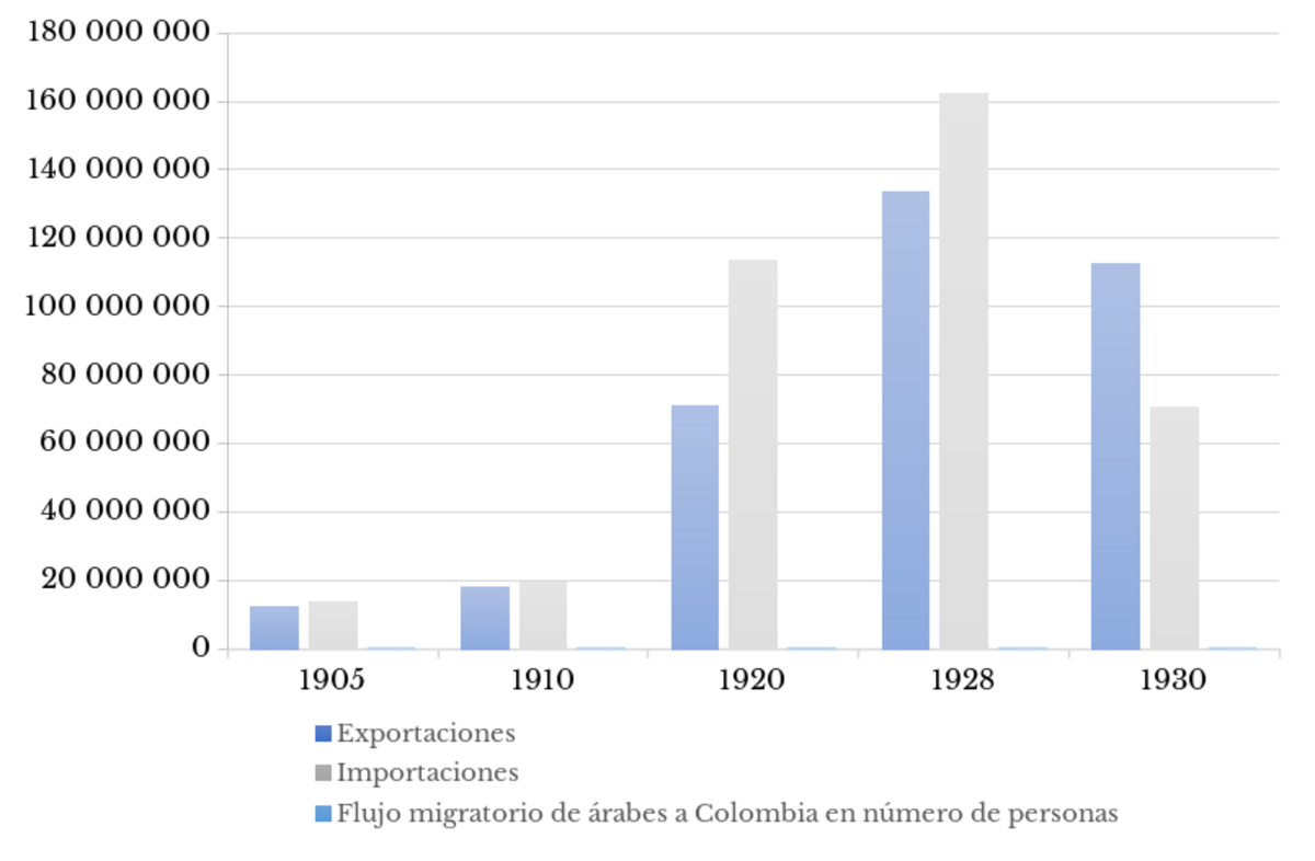 Al país llegaron tantos migrantes como pudo absorber la economía en la bonanza exportadora. En 1914, las exportaciones colombianas ascendieron a 221 098 toneladas, las importaciones fueron de 127 752, y no había más de 1 000 inmigrantes árabes. En ese mismo año, en Argentina había 64 000 árabes, pero ese país exportó 7 600 000 toneladas de productos e importó 77 300 000. El comercio exterior argentino era 35 veces mayor en las exportaciones y 605 más grande en las importaciones que el colombiano, por lo que pudo absorber 64 veces más migrantes árabes que Colombia (Argentina. Dirección General de Estadística de la Nación, 1923, p. 15; Colombia. Contraloría General, 1940, p. 13).