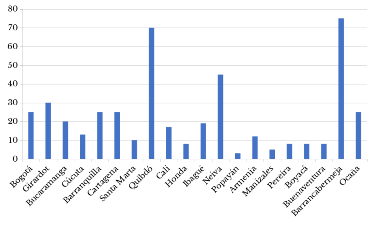 Mediante el modelo empresarial, los árabes lograron conformar, en promedio, 23% de los comerciantes minoristas en Colombia en 1930. La gráfica 4 muestra una aproximación de ese porcentaje en las principales ciudades, estimación que se basa en los datos publicados en directorios comerciales nacionales a lo largo de la década de 1920. Si los datos son precisos, indicarían que los siriolibaneses representaron casi un cuarto de los pequeños comerciantes en Colombia, y las redes comerciales que establecieron a través de su modelo empresarial fueron determinantes para alcanzar dicha participación. En Bogotá, Girardot, Neiva, Bucaramanga, Cali, Ibagué, Ocaña y la Costa Atlántica, los árabes representaban entre 18 y 23% de los comerciantes, pues en esas poblaciones lograron consolidar fuertes vínculos comerciales entre los puertos, los centros urbanos y las zonas de producción a través de sus redes de parentesco. Por su parte, en Boyacá y el Cauca, donde solo operaban algunos árabes poco conectados con los puertos y con las economías de exportación, estos inmigrantes tuvieron menos participación comercial.