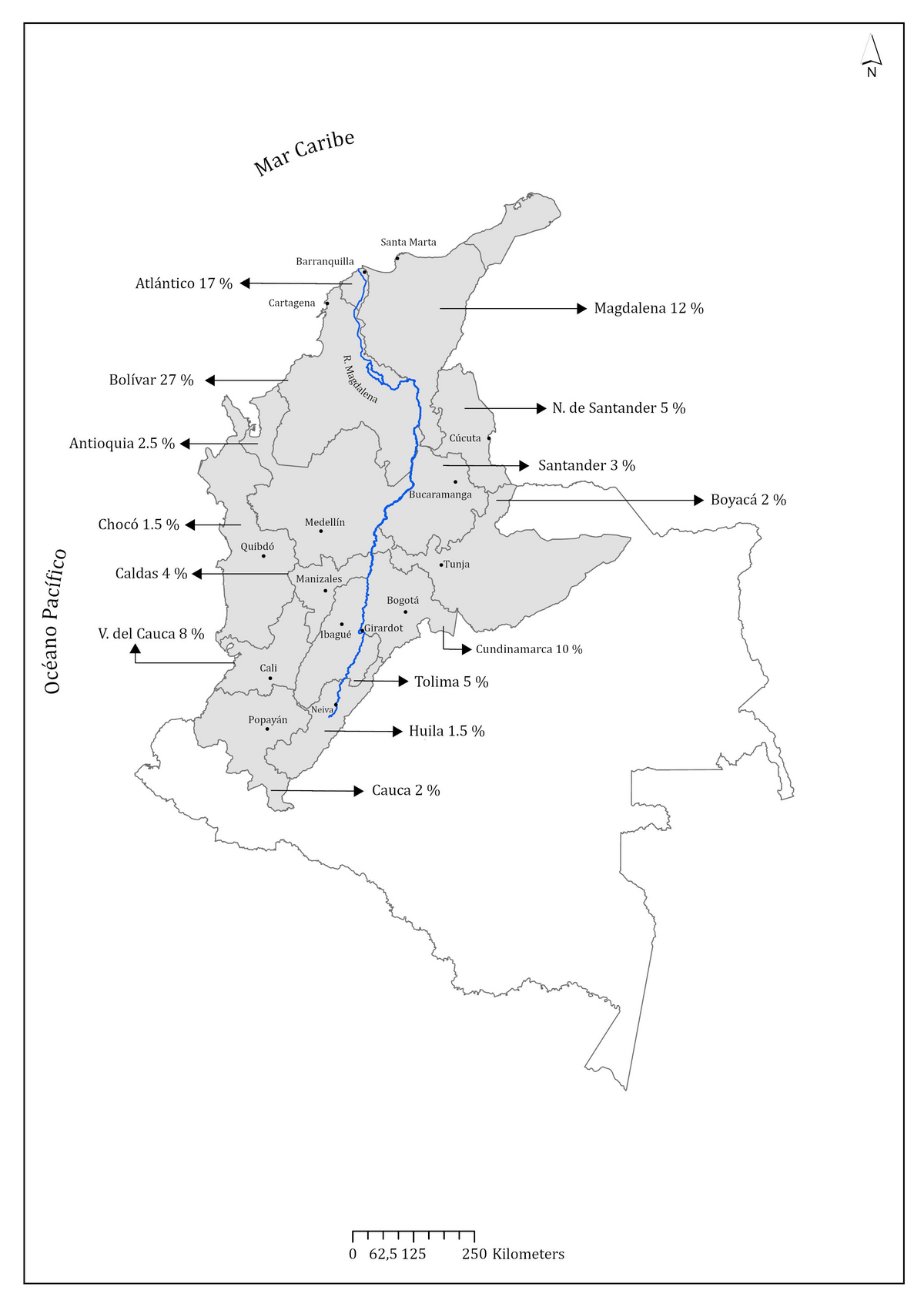 Los árabes configuraron dos de sus ejes comerciales a través del cauce del río Magdalena. Este río fue fundamental para el desarrollo comercial de Colombia desde la Colonia hasta mediados del siglo XX, cuando las carreteras, los ferrocarriles y la aviación conectaron de manera más eficiente el interior con el Caribe. El río Magdalena nace en el sur del Huila, en la frontera con el Cauca, y atraviesa el país de sur a norte entre las cordilleras Oriental y Central hasta Barranquilla, lo que lo convirtió en la ruta más eficiente, no sin penalidades de navegación, entre el interior, el Caribe y los mercados globales por más de cuatro siglos (Pearson, 1961).