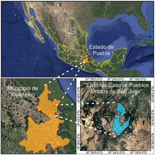 Este estudio se realizó en el ejido Los Catorce Pueblos Unidos de San Juan, municipio de Xiutetelco, al noreste del estado de Puebla (19°38’19.40” N -97°24’8.71” O y 19°45’12.72” N -97°22’3.77” O) (INEGI, 2021), con una elevación entre 2,500 y 3,000 m (Figura 1).