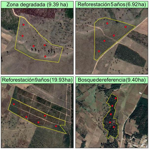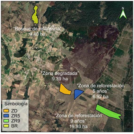 Para llevar a cabo este estudio, se seleccionaron cuatro zonas con condiciones abióticas y fisiográficas similares (exposición, pendiente y altitud). Dos zonas reforestadas con P. montezumae de 5 y 9 años (ZR5 y ZR9), un bosque de referencia de P. montezumae Lamb. y P. teocote Schiede ex Schltdl. (BR), área arbolada (remanente del bosque natural con cierto grado de perturbación) y una zona degradada (ZD), considerada como el testigo (t0), previa a la reforestación (Figura 2).