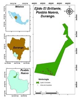 El estudio se realizó en el sistema montañoso de la Sierra Madre Occidental en el estado de Durango, en el ejido El Brillante, del municipio de Pueblo Nuevo, entre las coordenadas geográficas 23°50'44.85" latitud N, 105°22'2.95" longitud O y 23°46'49.38" N, 105°20'28.62" O con una Altura de 2600 m s.n.m. (Figura 1). De acuerdo con la clasificación de Köppen modificada por García (INEGI, 2007), el clima predominante en el área es el tipo C (E) (w), que corresponde a semifrío subhúmedo con lluvias en verano. La precipitación oscila entre los 1 000 a 1 200 mm anuales, con las temperaturas medias anuales de 11.5 ºC, las extremas más frías registradas de 8.3 ºC y las extremas más calurosas de 14.3 ºC (Quiñónez-Barraza et al., 2012). Los tipos de suelo conforman asociaciones entre Regosol, Litosol y Cambisol (UPSE, 2007). Los tipos de vegetación existentes son bosque de pino, bosque de encino, bosque de pino-encino, encino-pino y vegetación secundaria arbustiva en todas las comunidades vegetales (González-Elizondo et al., 2012).