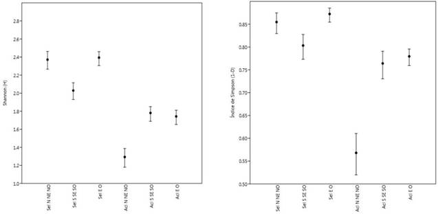 Existen diferencias entre tratamientos de selección y aclareos, mostrando una mayor diversidad el tratamiento de selección en exposiciones N NE NO que en S SE SO. Se observa también como el Aclareo N NE NO presentó la menor diversidad (Figura 2).