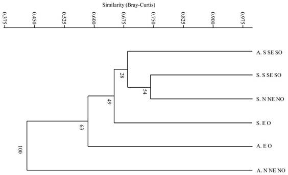 Figure 3 Dendrogram of similarity based on Bray Curtis analysis between treatments with different orientations. A: thinning and S is selection; N, S, E, W, W, NE, NW, SE, SW refer to the exposures where the studied plant communities were found. The numbers near each branch are the percentage of permutations supporting each split node in the final clustering dendrogram.