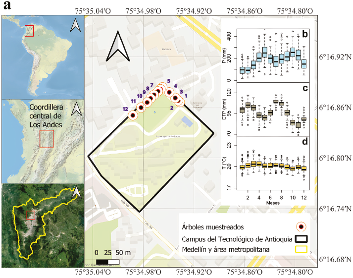 La ciudad de Medellín presenta una temperatura media anual de 20.1 °C, y una precipitación media anual de 2246 ± 339 mm, siendo los meses menos lluviosos enero y febrero con 99 ± 47 mm y 97 ± 41 mm respectivamente, y los meses más lluviosos mayo y octubre con 257 ± 88 mm y 237 ± 77mm respectivamente (Figura 1). A su vez, la evapotranspiración potencial media anual es de 1125 ± 8.9 mm y durante los meses menos lluviosos enero-febrero es de 95.8 ± 8 mm y 102.6 ± 8.5 mm, respectivamente (Figura 1). La información climática se obtuvo de las bases de datos del CRU: Climate Research Unit (1921-2022; Harris et al., 2020; Osborn et al., 2021).