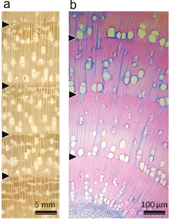 En total se obtuvieron 24 núcleos (Tabla 1, Datos Suplementarios: Tabla S1), pero uno de los núcleos (árbol 11, muestra b: Fu11b) se descartó porque durante el proceso de fijación sobre la moldura quedó girado y con el plano radial siendo el único visible. Por tanto, en este núcleo no fue posible medir los anillos de crecimiento. Los anillos de crecimiento de F. uhdei pueden apreciarse a simple vista, pues son fáciles de delinear y datar; estos se delimitan por porosidad semicircular, bandas de parénquima y cambios en el espesor de la pared de las células con células aplanadas radialmente (Figura 2).