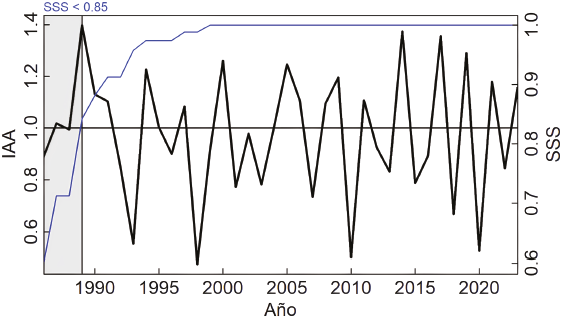 La sensibilidad media fue 0.52, valor que sugiere una alta variabilidad y sensibilidad de las series. La señal expresada de la población fue 0.87. Todos estos valores indican la robustez de la cronología sobre la señal aportada por los árboles (Tabla 1). La cronología resultante, a partir de los 12 árboles, presenta una extensión temporal de 36 años (1986-2023; Figura 3).