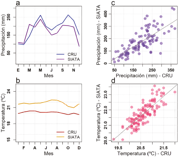 No obstante, existe una fuente de información con mayor extensión temporal (CRU: Climate Research Unit; Harris et al., 2020), resolución temporal mensual y lapso temporal de más de una centuria (1901-2022). Con el fin de validar la veracidad de los datos de precipitación mensual y temperatura media mensual disponibles en CRU, se realizó una correlación de Pearson entre las series temporales mensuales disponibles en SIATA con las series temporales mensuales del CRU para el mismo periodo.