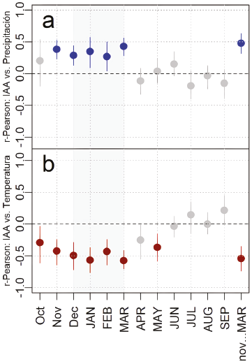 Figura 5 Crecimiento vs. Clima durante los meses de mayor probabilidad de crecimiento (octubre año previo, septiembre año corriente). a) Correlación con bootstrap entre la cronología de anillos (IAA) y la precipitación mensual y b) Correlación con bootstrap entre el IAA y la temperatura mensual. Los meses en minúscula indican el año previo, los meses en mayúscula representan el año corriente. La significancia estadística de las correlaciones se indica mediante líneas resaltadas (relación significativa, p < 0.05), en azul y rojo: correlaciones significativas positivas y negativas respectivamente, en gris: relación no significativa, p > 0.05.