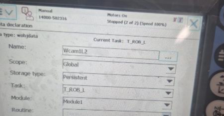 PERS wobjdata Wcam1L2:=[FALSE,TRUE,"",[[383.361,-12.2866,-0.704813],[.71137,0.0153852,0.0151982,0.702485]],[[4.05847,-3.98945,0],[.967522,0,0,0.252787]]];