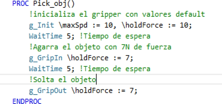 Se realizó un programa de prueba para verificar que funciona correctamente para el agarre de un objeto, para esta prueba se utilizara un frasco de vidrio, inicializaremos el gripper con una fuerza de agarre de 10N y a una velocidad de 10mm/s, posteriormente y le aplicaremos una fuerza de 7N para asegurar la integridad del recipiente.