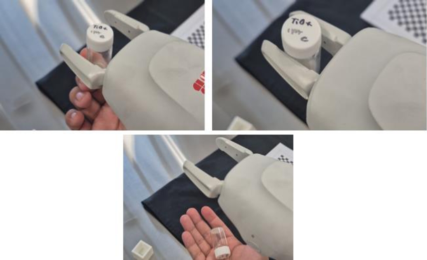 Los resultados mostraron que, debido a las desviaciones de 2 a 6 mm, el robot no fallaba en recoger el frasco, sin embargo, existía la posibilidad de que aumentara el riesgo de daños o errores en el proceso. Enlace a video demostrativo aquífn