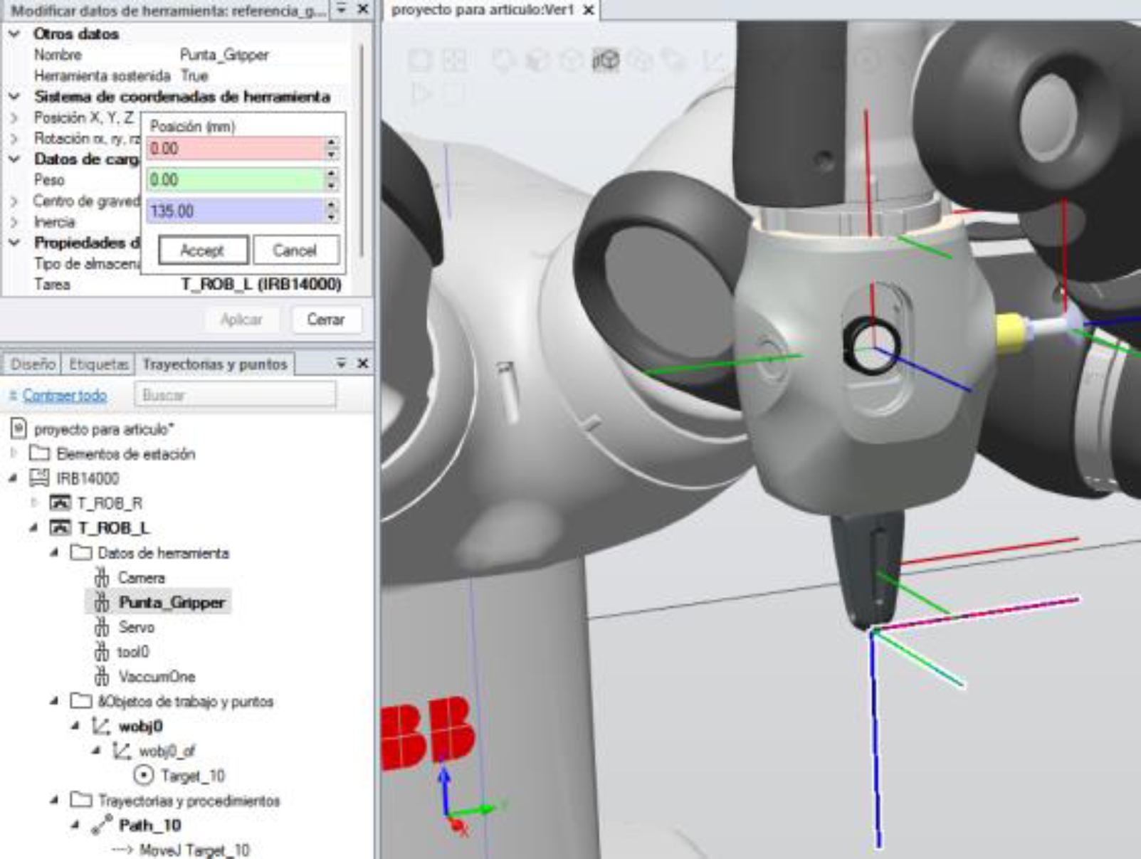 Desde el software creamos un nuevo TCP que este será la punta del gripper, ya que lo utilizaremos como palpador o calibrador de punta, lo establecemos a la distancia en Z de 135.00mm.