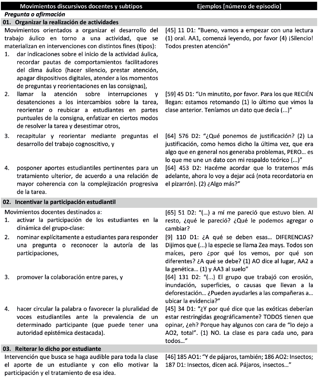 A continuación, el primer autor, inspirado en un conjunto provisional de códigos extraídos de la bibliografía (proceso deductivo) (De Longhi et al., 2012; Cubero Pérez et al., 2008), hizo una relectura de los memos analíticos y transcripciones con el fin de capturar características y variaciones en los MDD, recopilando y agrupando los fragmentos discursivos de interés. Para esta instancia y las posteriores, el nivel de análisis de microescala elegido fue el del enunciado (Hennessy et al., 2020), que contempla la existencia de más de un acto de habla dentro de cada turno de habla. Por ejemplo, un docente en un mismo turno puede solicitar que hagan silencio, introducir un problema y nominar a un estudiante a que responda. Luego, el primer autor refinó iterativamente estos códigos (en función de la adecuación a los datos) y agregó nuevos derivados de los mismos datos (proceso inductivo) (Carpenter et al., 2020).