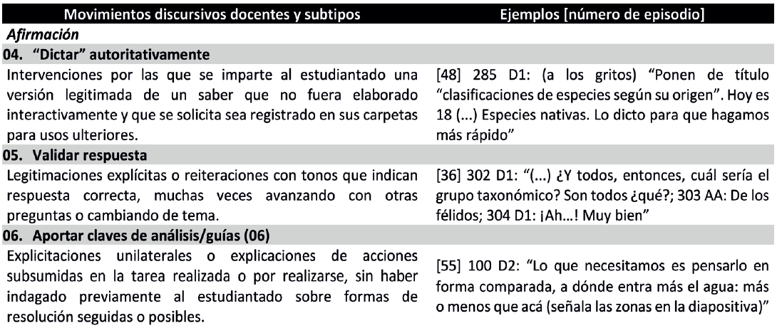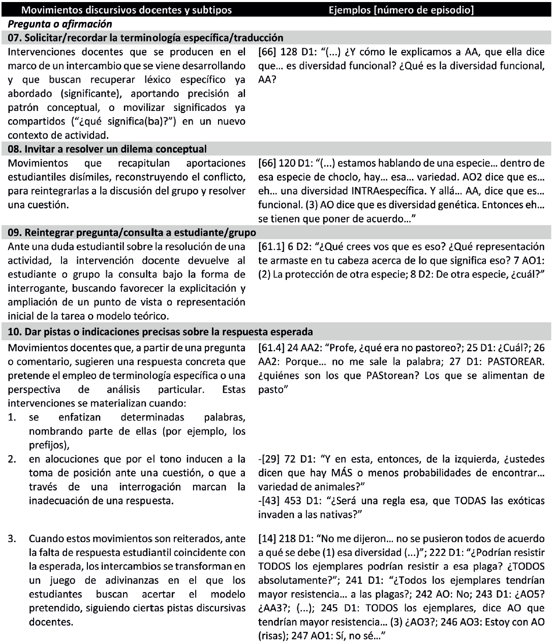 Finalmente, se volvió sobre las transcripciones originales analizando independientemente cinco clases enteras para refinar las categorías, los códigos y la selección de fragmentos de interés, para luego alcanzar nuevamente el consenso sobre la denominación de los códigos, su definición, la compilación de extractos y la elección de al menos un fragmento de ejemplo, que fuera representativo y útil para ilustrar los MDD (Carpenter et al., 2020; González-Howard y McNeill, 2020). Del conjunto final de tres categorías y 40 códigos de MDD, con dos variantes (pregunta y/o afirmación), por una cuestión de foco y espacio, presentamos a continuación los resultados de las dos primeras categorías: clima de trabajo y puntos de vista/dialogicidad. Por su extensión, decidimos solo ejemplificar y discutir a continuación algunos de los MDD más representativos y fértiles para abrevar a la dialogicidad en el aula.