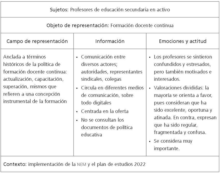Este cambio en las estructuras significa una irrupción en el pensamiento social de los docentes de educación básica, pues durante por lo menos 30 años se consolidó una política de formación continua que ahora se transfigura. Por ende, es de esperar que haya iniciado un proceso de cambio en el que se modifican no solo los instrumentos de planeación institucional, sino los mecanismos que proyectan acciones y prácticas que resultan ajenas o desconocidas para el profesorado. Es así como se parte del supuesto de que la formación continua, siendo un objeto relevante para el colectivo, está incorporando novedades que se anclan a saberes arraigados, no se trata de una incorporación directa o mecánica, sino de un proceso en el que los agentes construyen sus significados, opiniones, valores y actitudes, de tal manera que los cambios estructurales se condensan en las representaciones sociales.