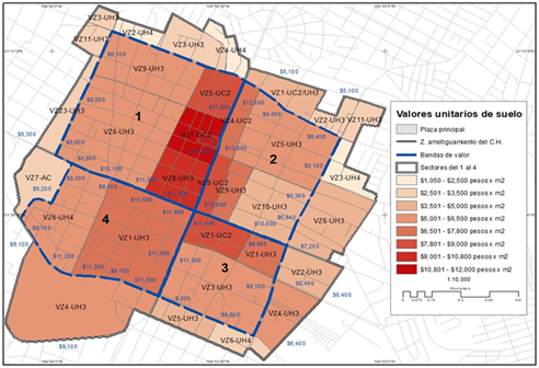 La intersección entre la avenida México y la avenida Allende, que atraviesan el centro histórico de oriente a poniente (ambas en color azul), crea el punto de partida para los valores de suelo más altos que disminuyen conforme el suelo se aleja de este punto en cualquier dirección, con excepción del suelo emplazado alrededor de la Plaza Principal ya mencionado.