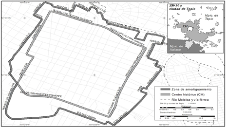En relación con esto, el centro histórico de Tepic es decretado, compuesto por 146 manzanas, contempla también las manzanas aledañas inmediatas a su perímetro como área de influencia y amortiguamiento para los programas de reordenación, conservación y protección urbana (Acuerdo de la declaratoria de inmuebles…, 1989) (figura 2).
