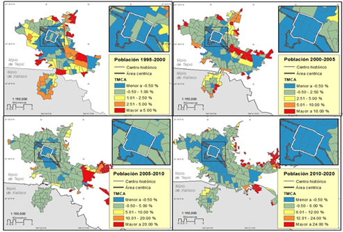 Las TMCA más bajas (color azul) no sólo se presentan en el centro histórico, sino también en buena parte del interior de Tepic y Xalisco. Así, a lo largo del tiempo, las TMCA de colores azul y verde −o de menor crecimiento− han acaparado de forma progresiva mayor extensión territorial al interior de la ZM-30.
