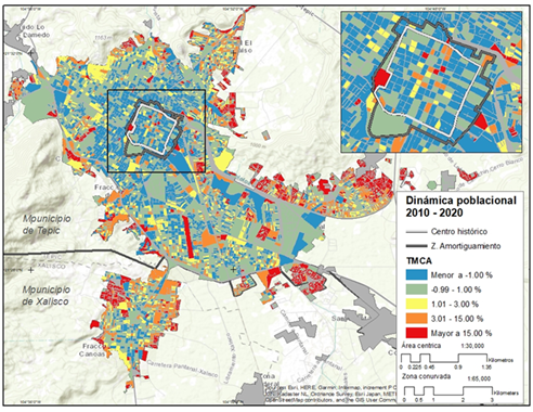 Fuente: elaboración propia en ArcGis 10.4.1 (ESRI, 2016), con base en el Censo de Población y Vivienda Inegi (2020 y 2010) y el Marco Geoestadístico del (Inegi, 2022b y 2010).
