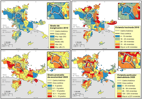 Fuente: elaboración propia en ArcGis 10.4.1 (ESRI, 2016), con base en el Índice de marginación urbana del Conapo (2021), el Censo de Población y Vivienda (Inegi, 2020) y el Marco Geoestadístico del Inegi (2022b).