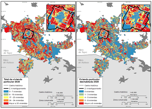 La figura 7 expone la vivienda particular y la vivienda particular deshabitada en la ZM-30 a nivel de manzanas urbanas de 2020 (Inegi, 2020). La sección izquierda muestra una zona centro-norte con importantes cantidades de vivienda particular (color rojo); sobresale que el centro histórico en su área más central carece de esta vivienda (color azul). Por su parte, la sección derecha exhibe a la vivienda particular deshabitada presente en el total del área urbana; no obstante, resalta una importante concentración en la zona centro-norte en donde se encuentra el centro histórico. En el perímetro del centro histórico se encuentran elevadas cantidades de vivienda deshabitada (color rojo), y en su área más central las cantidades más bajas (color azul), como ya se mencionó líneas arriba, debido a la inexistencia de vivienda particular en dicha área central.