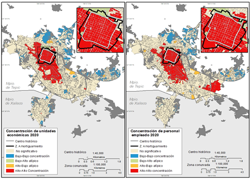 La figura 8 expone dos LISAs (Local Indicator of Spatial Association) que señalan las principales concentraciones de unidades económicas y de personal empleado en la ZM-30 a nivel de manzanas urbanas, de acuerdo con el Directorio Estadístico Nacional de Unidades Económicas (Inegi, 2022a). Aunque las unidades económicas y su personal empleado se presentan en el total del área urbana, hay un principal conglomerado de considerable extensión territorial en la ciudad interior que acapara al centro histórico (color rojo). Es un centro económico que genera importantes dinámicas socioeconómicas para el interior y el exterior del área urbana; además, al suroriente aparece la ciudad industrial como un polígono de alta concentración de personal empleado.