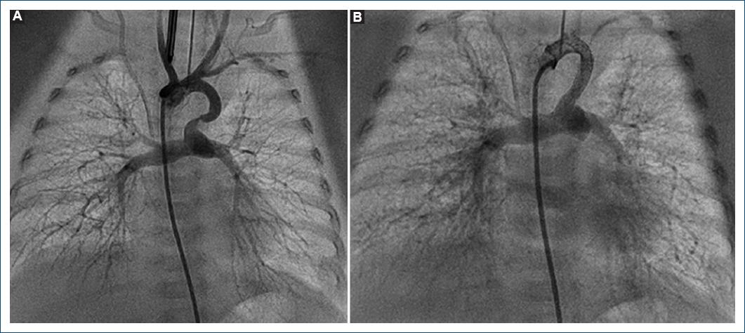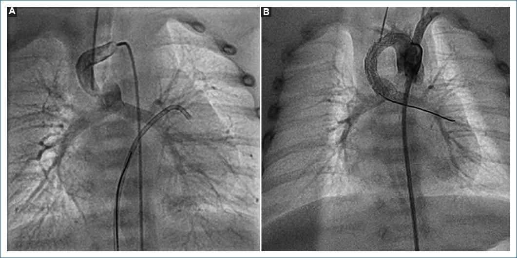 Figura 2 A: angiografía que evidencia origen del conducto arterioso en el tronco braquiocefálico izquierdo en un paciente con tetralogía de Fallot y arco aórtico derecho. Se evidencia algo de tortuosidad y constricción en el tercio proximal a la arteria pulmonar. B: angiografía tras la angioplastia con colocación de dos stents.