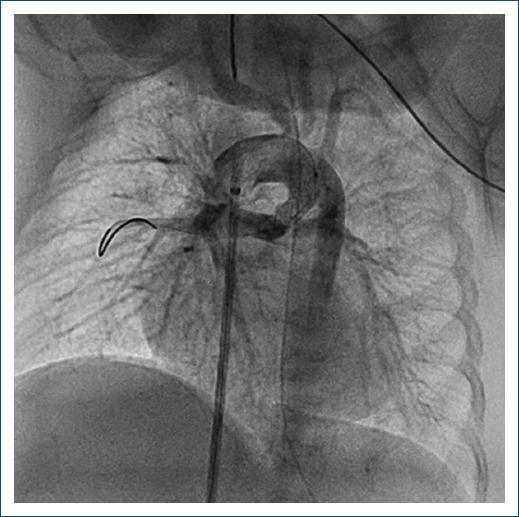 Figura 3 Angiografía tras la angioplastia con un stent en un conducto arterioso originado en el arco transverso en un paciente con atresia pulmonar con comunicación interventricular.