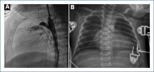 Figura 4 A: angiografía en un paciente con anomalía de Ebstein con atresia pulmonar que evidencia un conducto arterioso con origen en la aorta descendente. B: radiografía de tórax de control que evidencia cardiomegalia a expensas de la aurícula derecha, arco pulmonar excavado y punta elevada con normal posicionamiento del stents ductal.