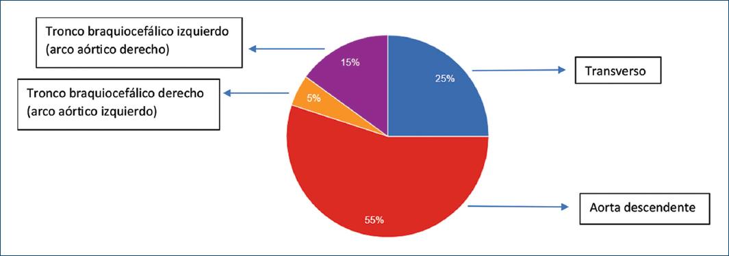 Se incluyeron en el estudio 20 pacientes. Las características basales previas al procedimiento, tanto clínicas como anatómicas, se describen en la tabla 1. En cuanto a la morfología ductal, el 35% correspondían a morfología tortuosa y el 65% a conductos rectos. En la figura 5 se describen los distintos orígenes del conducto arterioso, que se ejemplifican en las figuras 1 a 4. En la tabla 2 se destacan las características de los pacientes al momento del procedimiento.
