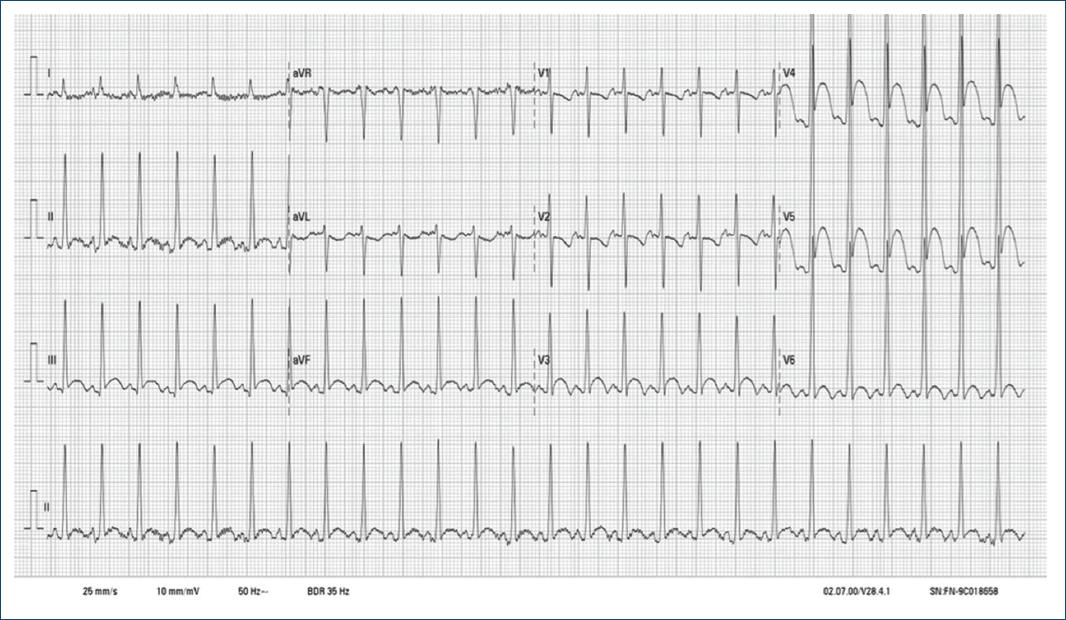 La presencia de rabdomiomas es un criterio mayor para el diagnóstico clínico de esta enfermedad; habitualmente son múltiples y con frecuente remisión espontánea1. El electrocardiograma basal suele mostrar alteraciones inespecíficas de la repolarización, siendo eventuales la preexcitación o los trastornos de la conducción2. En el curso clínico se han descrito fenómenos arrítmicos, como extrasistolia ventricular, taquiarritmias supraventriculares o ventriculares y, con menos frecuencia, trastornos avanzados de la conducción3. La elevación manifiesta con patrón regional del segmento ST constituye una manifestación infrecuente.