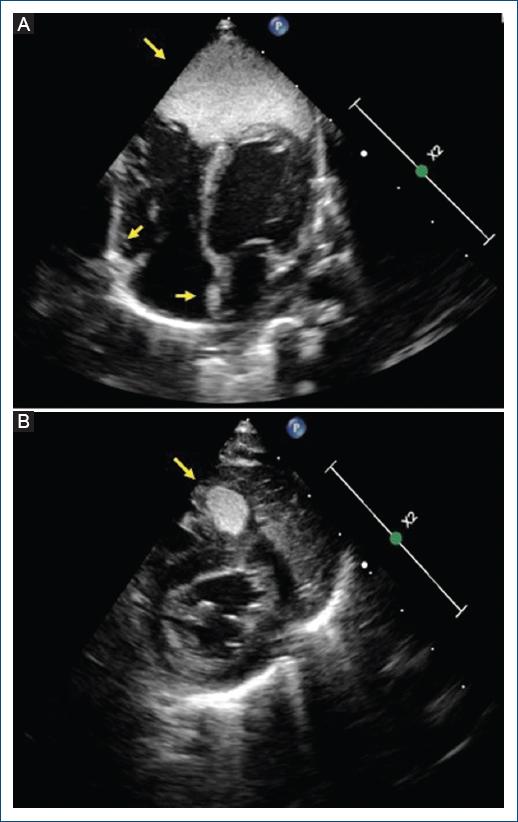Figura 2 Ecocardiograma transtorácico. A: plano apical de cuatro cámaras. B: plano paraesternal eje corto.