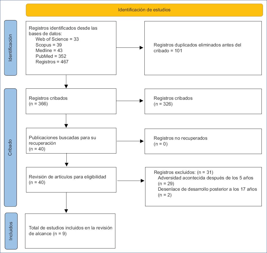 Criterios de exclusión: a) artículos no referidos a identificar experiencias que moderen el impacto de la adversidad en el desarrollo infantil; b) evaluación de factores intrínsecos que pueden ser protectores (p. ej., capacidad cognitiva, temperamento, autoestima, espiritualidad); c) artículos no referidos a seres humanos; d) revisiones, editoriales, cartas y otros tipos documentales, y e) artículos no disponibles a texto completo.
