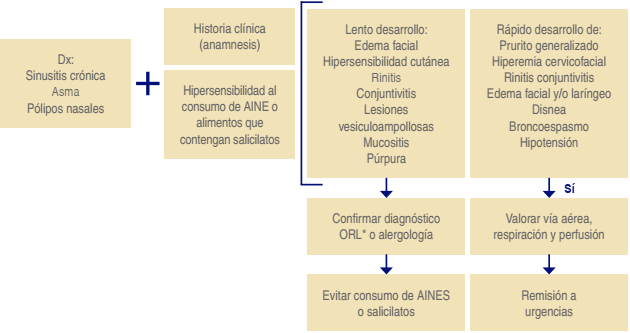 Una anamnesis con historia de asma, urticaria, escurrimiento nasal, poliposis nasal, hipo o anosmia, a veces síntomas gastrointestinales, hasta síntomas cardiovasculares en respuesta a una reacción de hipersensibilidad después de la ingesta de algún AINE, muy probablemente se trata de una EREA.14,15