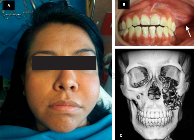 Mujer de 26 años quien acude a consulta externa del Servicio de Cirugía Maxilofacial del Hospital General Zona Norte Puebla, referida por presentar aumento de volumen en región maxilar posterior lado izquierdo (Figura 1A), mismo que es tratado con antibiótico sin mejoría por facultativo. A su ingreso se realiza historia clínica sin datos relevantes para su padecimiento actual, a la exploración física se aprecia cráneo normocéfalo sin hundimientos ni exostosis, región frontal sin alteraciones, región orbitaria asimétrica a razón de ligera proptosis lado izquierdo, movimientos oculares y visión conservados, pabellones auriculares íntegros, simétricos, sin salida de secreciones patológicas a través de conductos auditivos externos, nariz, central dorso recto, narinas permeables, región cigomática lado izquierdo con aumento de volumen, no álgica, no hipertérmica, no hiperhémica, de consistencia sólida, bordes mal delimitados, coloración de piel similar a la adyacente, apertura oral de 3.5 cm aproximadamente, mucosas de adecuada coloración e hidratación, oclusión habitual y estable, presenta aumento de volumen en fondo de saco superior izquierdo a nivel de región molar intraoralmente (Figura 1B), no álgico a la palpación, no hiperhémico, no hipertérmico, consistencia firme, ligeramente blanda, cuello cilíndrico con tráquea central y desplazable, sin adenomegalias, tórax normolíneo con campos pulmonares bien aereados, ruidos cardiacos de buen tono e intensidad, abdomen blando depresible sin datos de irritación peritoneal, genitales diferidos, extremidades integras, simétricas con llenado capilar distal de tres segundos.
