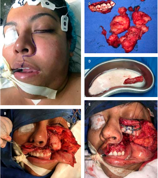Figura 2 A) Marcaje Abordaje Weber-Ferguson modificado. B) Fotografía intraoperatoria del mixoma odontogénico. C) Pieza quirúrgica. D) Injerto óseo costal. E) Fijación del injerto costal osteosíntesis 2.0 y malla de titanio 0.6 mm.