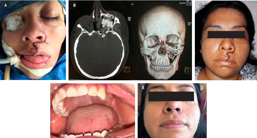 Figura 3 A) Postquirúrgica inmediata. B) Tomografía computarizada simple de la malla colocada como piso de órbita. C) Postquirúrgico dos días. D) Postquirúrgico un mes intraoral. E) Fotografía postquirúrgica de un año donde se observa una adecuada evolución.