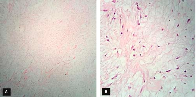 El informe final del estudio histopatológico confirmó el mixoma odontogénico (Figura 4). Secciones teñidas con hematoxilina-eosina muestran una lesión neoplásica benigna destructiva compuesta por una proliferación abundante de células anguladas y fusiforme inmensas en un estroma de tejido laxo y mixoide con áreas de fibras colágenas delgadas dispuestas en forma aleatoria y que infiltran un hueso maduro de la zona destruyendo y perforando las corticales; el hueso se observa en cantidad abundante y muestra también áreas de necrosis. También se observan algunas áreas de fibras colágenas densas dispuestas de forma aleatoria y zonas de vasos mediano calibre mezcladas y dispuestas en el estroma mixoide. En áreas cercanas a las trabéculas oseas se encuentra colágena densa y borde óseo con osteoblastos periféricos. En la periferia se observan amplias zonas tumorales separadas por una pseudocápsula de tejido fibrocolágeno.