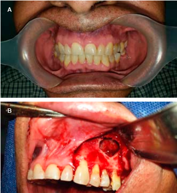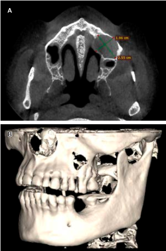 Figure 1 Intraoral of view. A) Mucosa coloration normal and bone structures are symmetric. B) Surgical resection of the Keratocyst, was confirmed bone lysis in the palatal region and communication with the ipsilateral nostril.