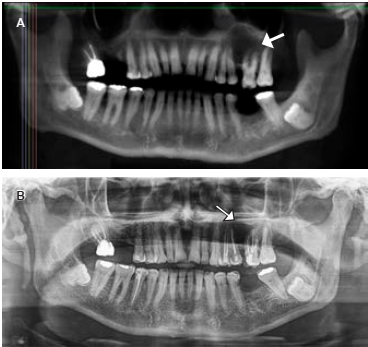 Figure 2 Orthopantomography. A) The arrow shows radiolucent area with a defined edge defined, B) Control orthopantomography at 6 months. The area occupied by the Keratocyst is in frank recovery.