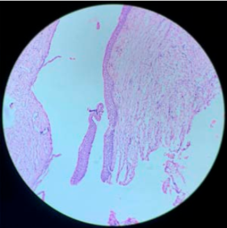 Definitive diagnosis: the histopathology reports a cavity without apparent content, thin odontogenic epithelium lining without projections towards its capsule and detached in most sections of its fibro-connective capsule. Flat stratified epithelium of 6 to 8 cell strata, hyperchromatic basal layer and para-keratinized surface were identified, with all these pathological features allow the diagnosis of OKC (Figure 4).1,6,7